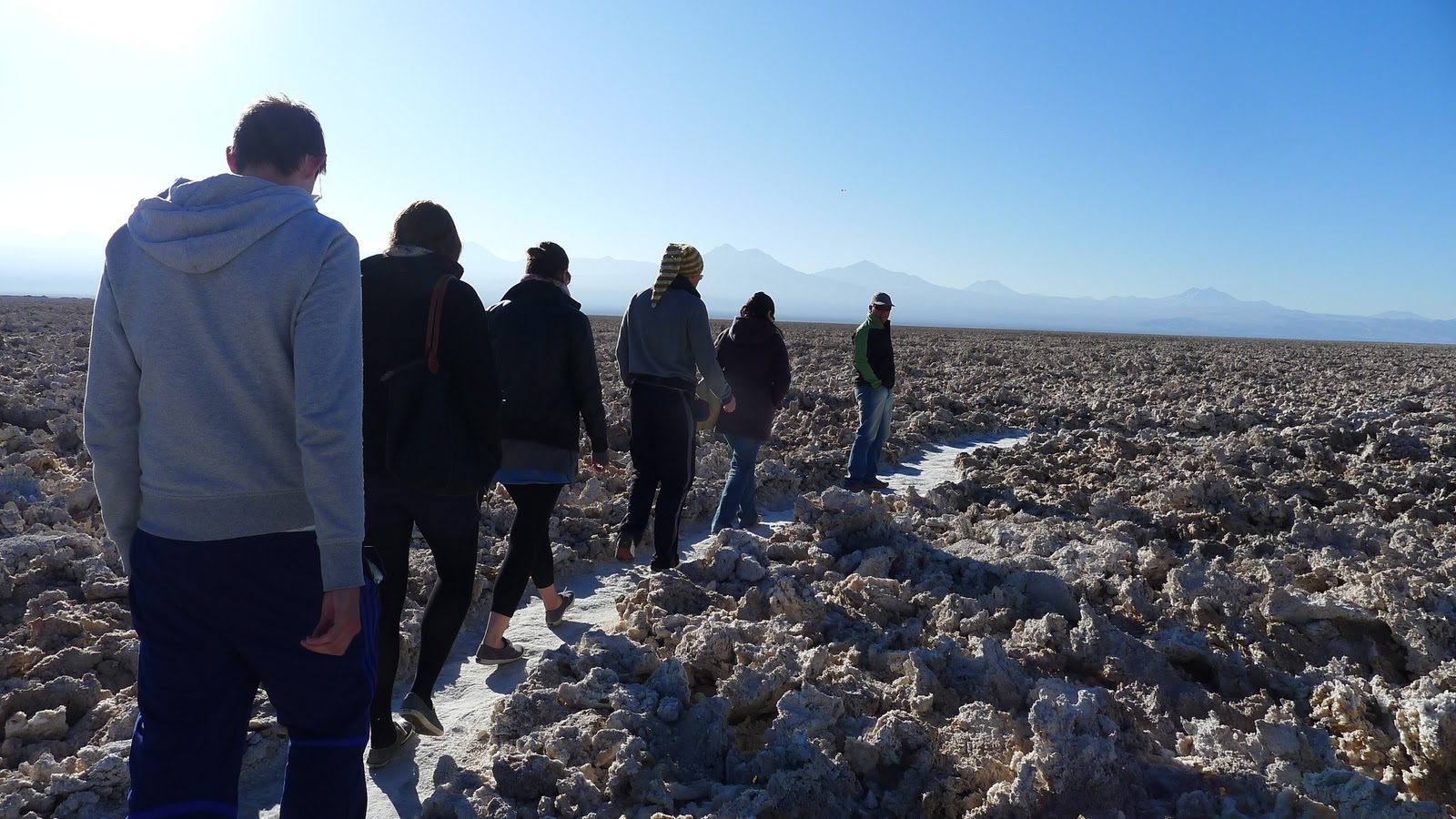 The previous day’s brown, hot, and dusty landscape had made way for the very white and cold landscape you see above.  Though it resembled ice, we were told that what we were walking on was indeed salt, hardened and accumulated over time. While I was astounded by my surroundings, the climate was equally boggling to me. Just yesterday I was sweating away and peeling off layers of clothing, while here I shivered and actually felt inadequately dressed!  My thin gloves and fleece barely shielded me from the cold and I was thankful that I had thought to bring my scarf.  Funnily enough, that very scarf, which had protected me from blowing sand the day before, was now serving to keep my ears and head warm! We were about 7000 feet above sea level, which would explain the drastic downward drop in temperature.